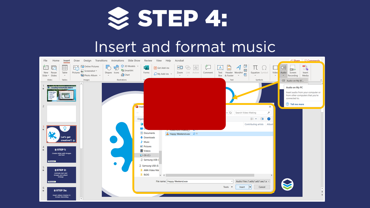 Insert audio: Click Insert and select Media , then we want Audio and the Audio on my PC option.